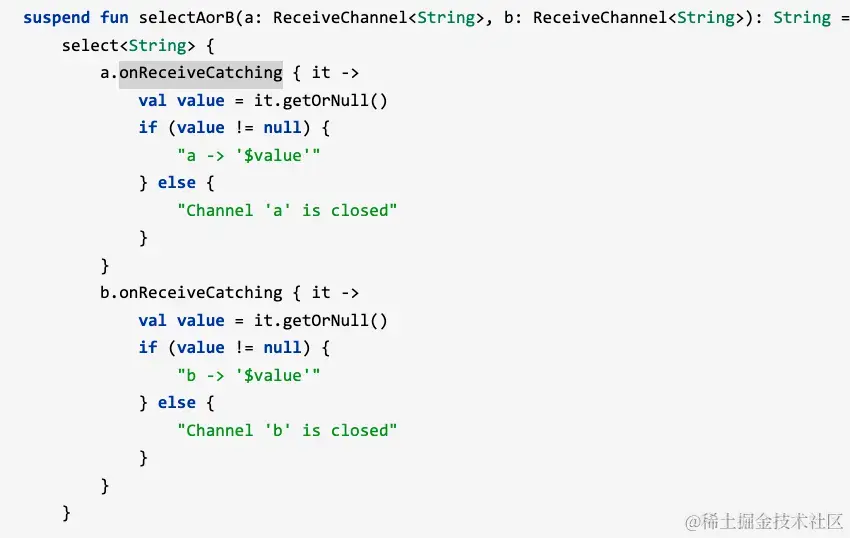 通道的关闭会导致通道的select选择的onReceive函数语句失败且抛出对应的异常,对于此可以使用函数onReceiveCatching对其进行抓取并处理其异常。即: