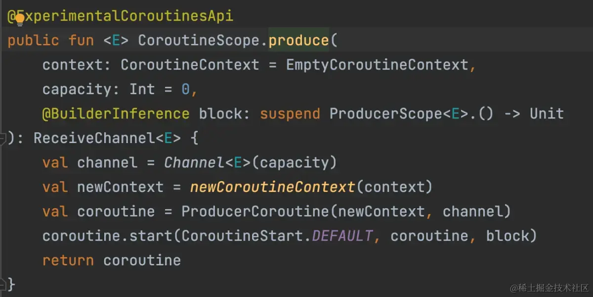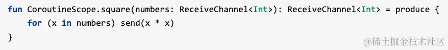 备注:如图所示,produce是CoroutineScope提供的一个扩展函数,参数为上下文,通道缓冲区大小和产生序列数的lambda表达式,封装了通道的创建及其上下文环境,可以让用户专注于生产数序列即可。