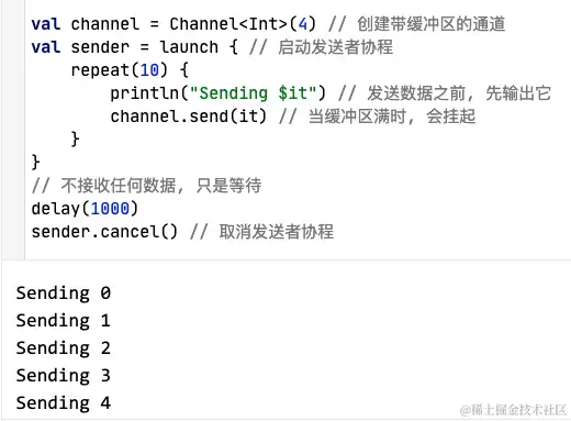 capacity参数, 用来指定 缓冲区大小. 缓冲区可以允许发送者在挂起之前发送多个数据, 类似于指定了容量的BlockingQueue, 它会在缓冲区已满的时候发生阻塞.