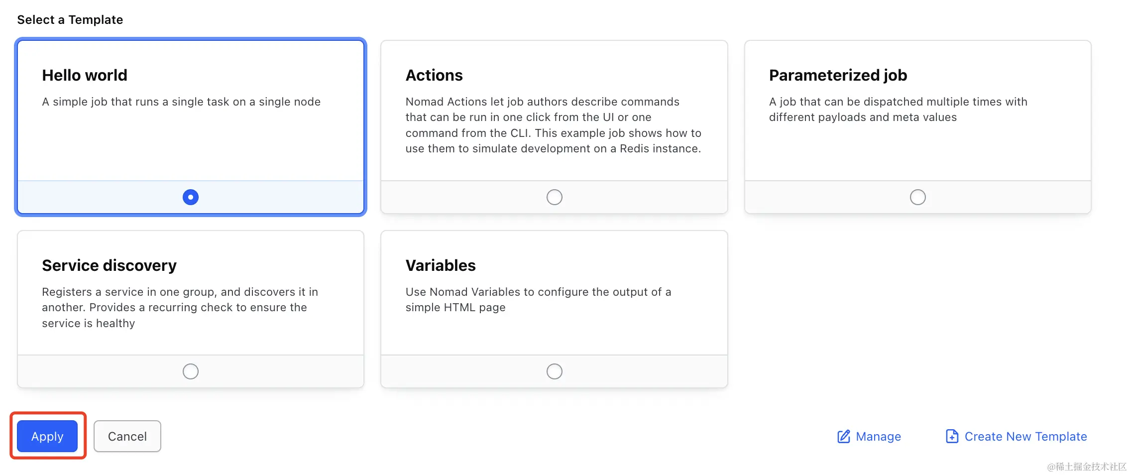 从 templates 中选择 Hello World 模版并且执行它