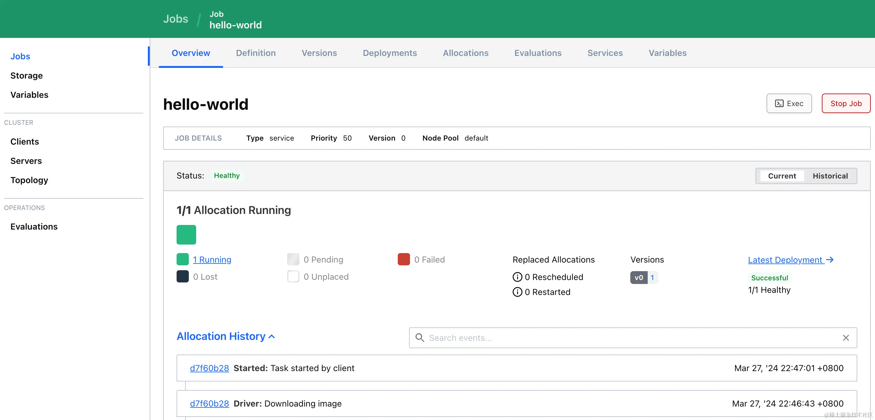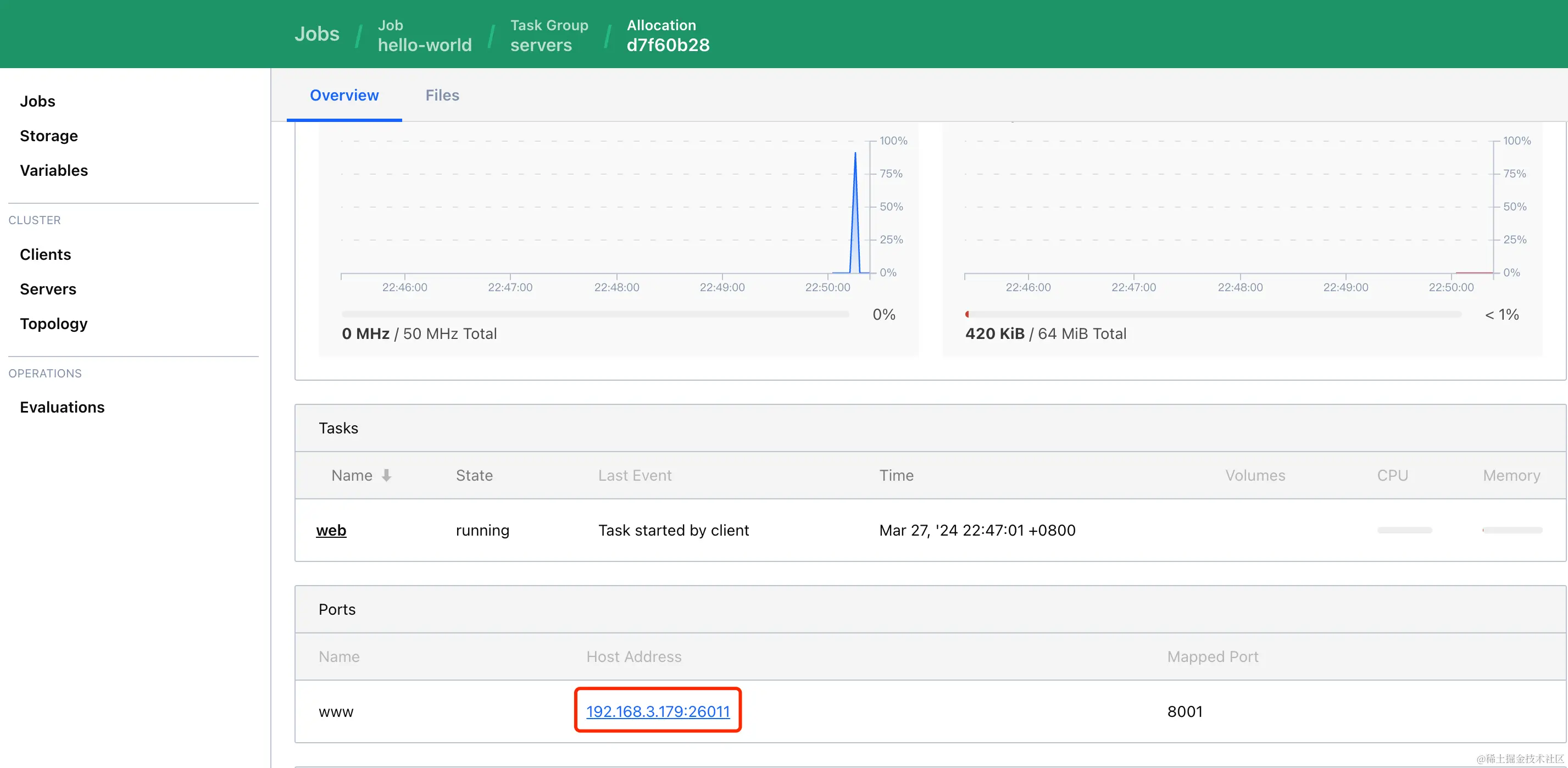 之后 点击 Allocations -> 选中具体任务,就可以找到系统为 Job 分配的 IP 和端口号
