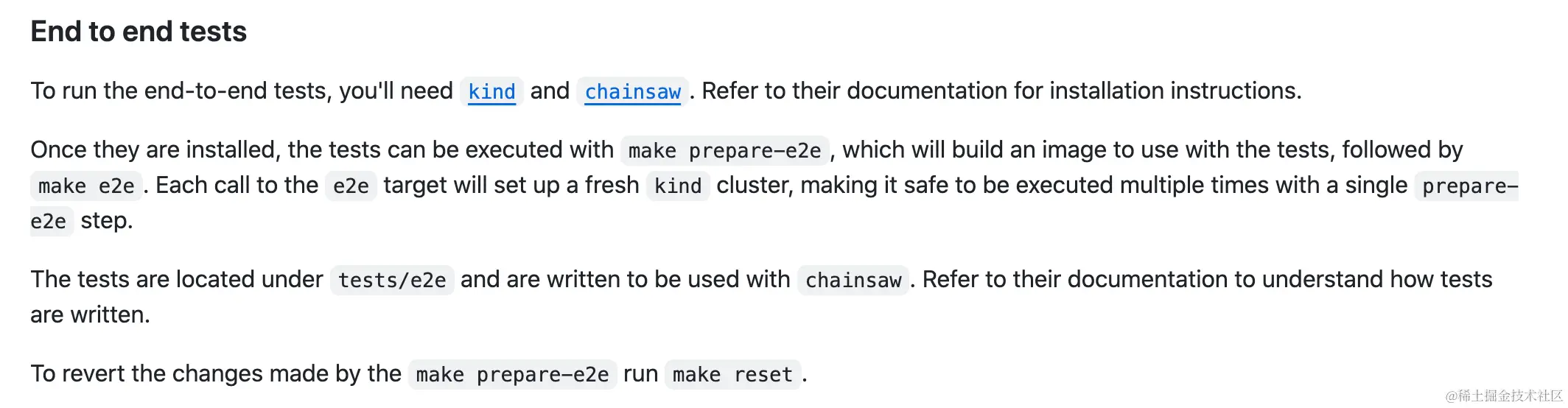 在这之前我其实也很少做 kubernetes 的 operator 开发,对如何做 kubernetes 的 e2e 测试也比较陌生,好在社区提供了详细的贡献文档。