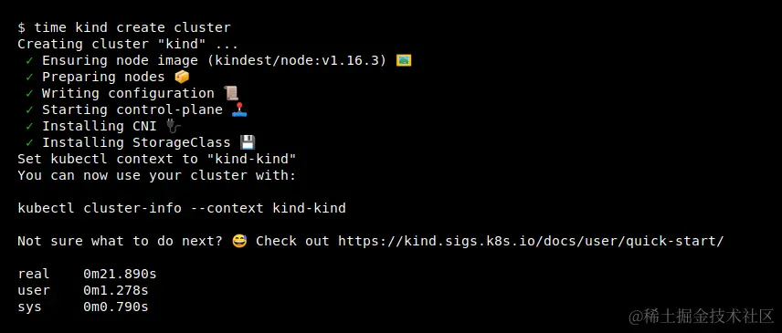 安装好 kind 之后,使用 create cluster 命令可以在本地创建一个 kubernetes 集群。
