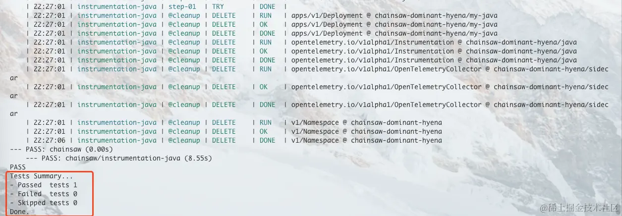 这样它就会遍历该目录下的 chainsaw-test.yaml文件进行测试,执行我们上面定义的那些步骤,最终输出测试结果: