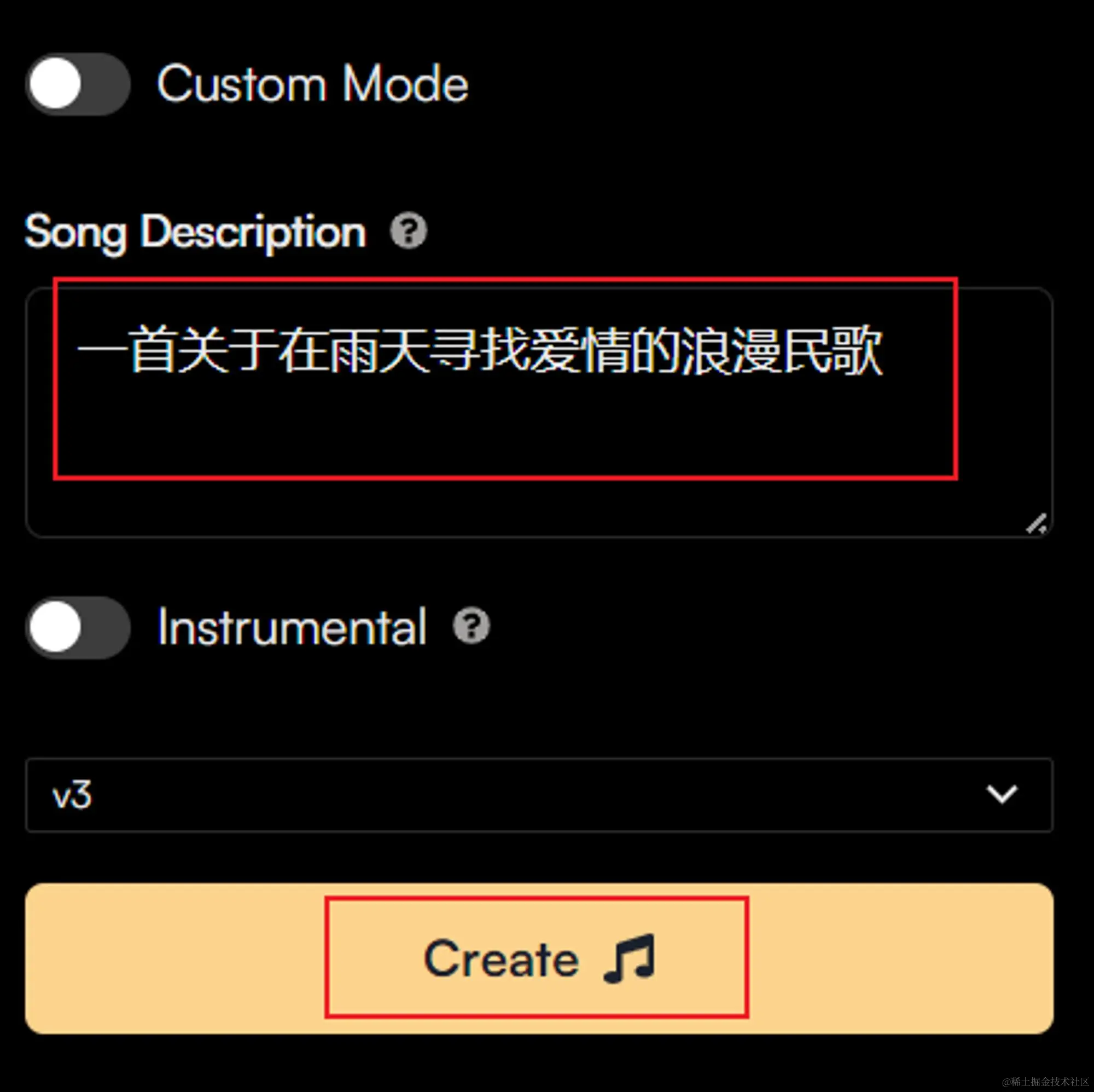 我们在Song Description中输入一首关于音乐主题的描述:“一首关于在雨天寻找爱情的浪漫民歌”,然后点击下方的Create按钮进行音乐生成。