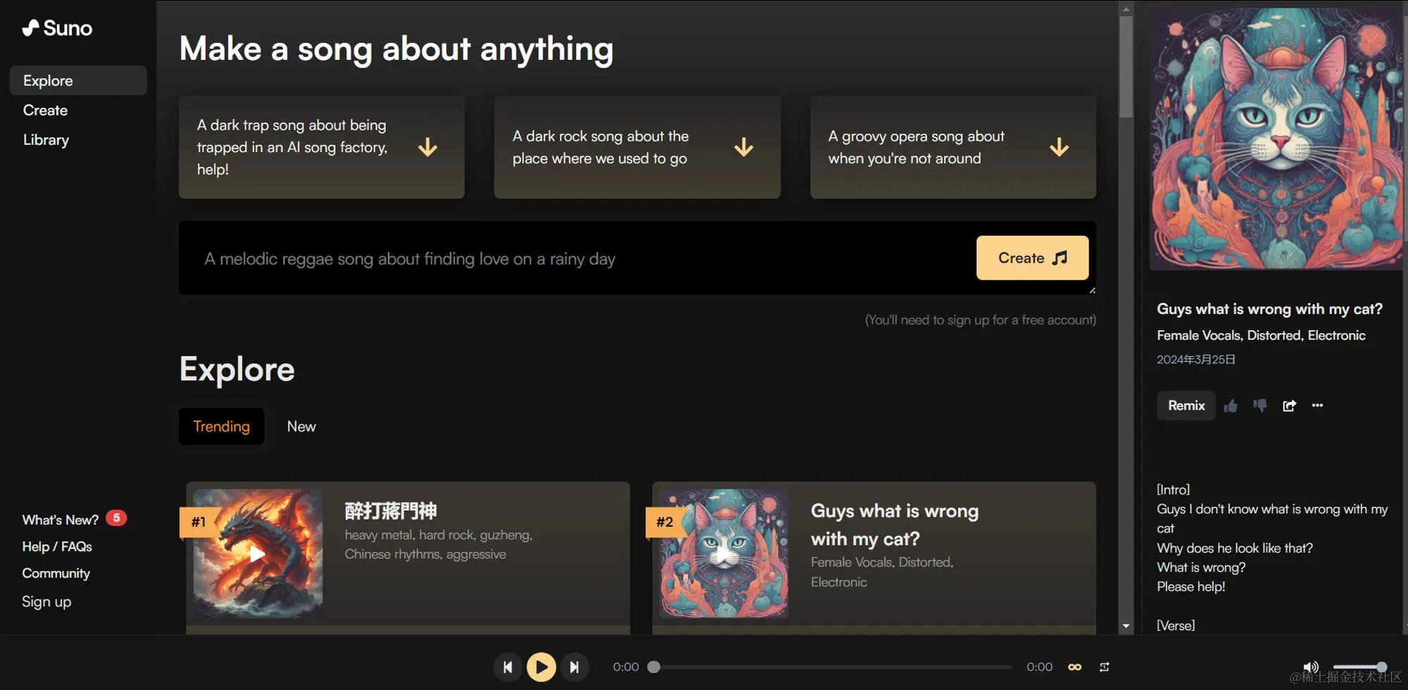 访问官网,左边一列是菜单,中间是用户创作的AI作品,可试听。右边一列可以查看一首音乐的歌词信息。