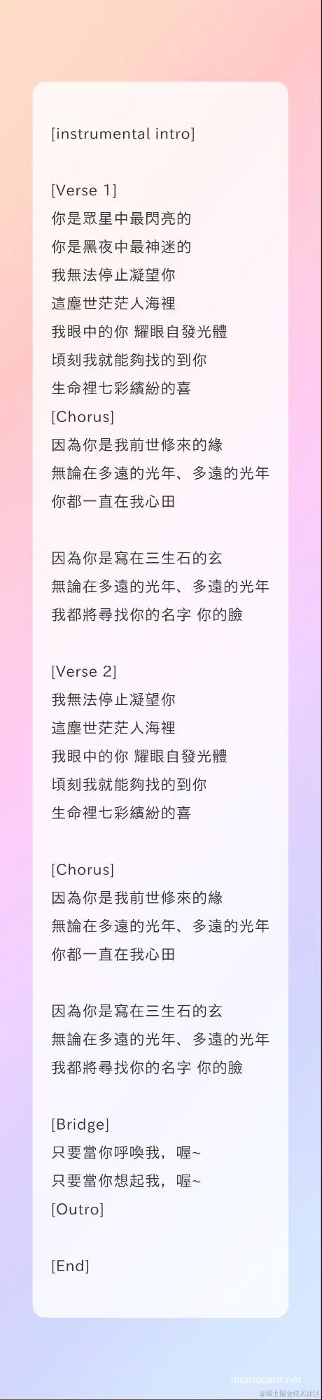 此外还可以用一些复制的用法,例如吉他独奏可以使用:[Guitar Solo Interlude],副歌使用日语:(Verse 1 - Japanese),合唱使用英语:(Chorus - English)等等。
