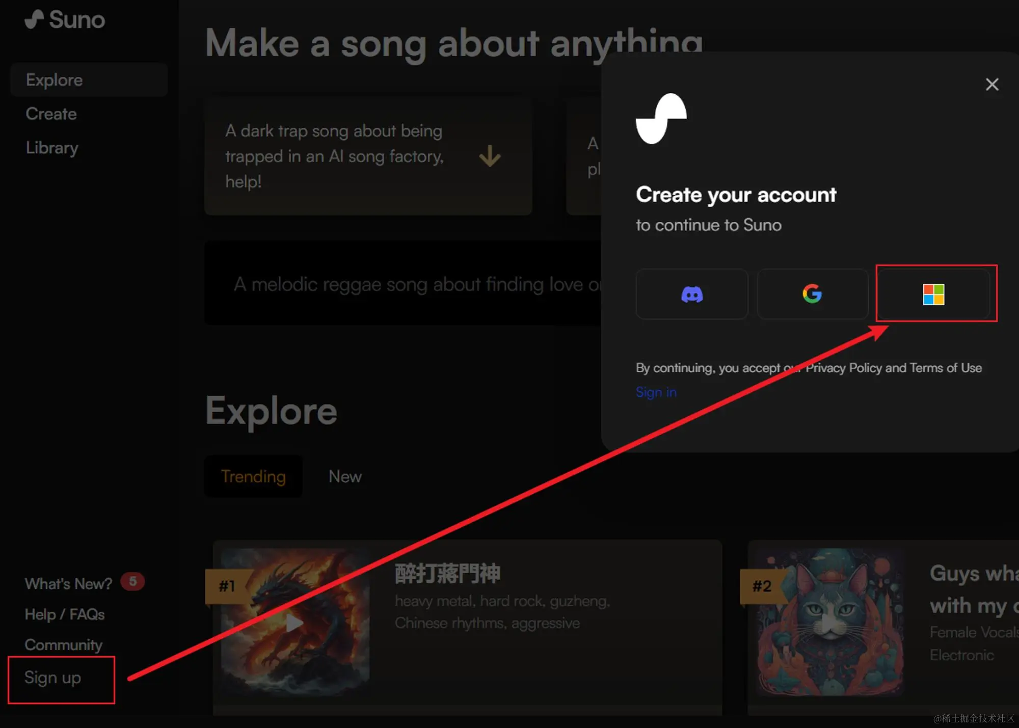 点击左下角的Sign Up按钮进行注册登录,在弹窗中选择第三个微软图标,使用微软Outlook账号进行登录。如果你有Discord、谷歌账号也可以用这两个账号进行登录。