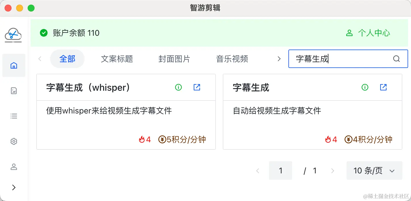 打开智游剪辑(官网: zyjj.cc),搜索字幕生成,目前有两个字幕生成方式,一个是基于whisper的,一个是腾讯云的,一般来说whisper的效果会比腾讯云的更好一点,我们可以根据自己的选择来选择合适的方式
