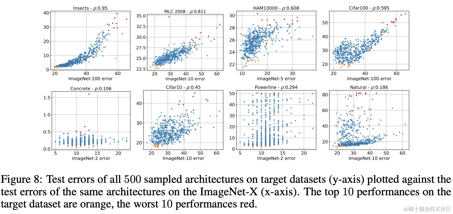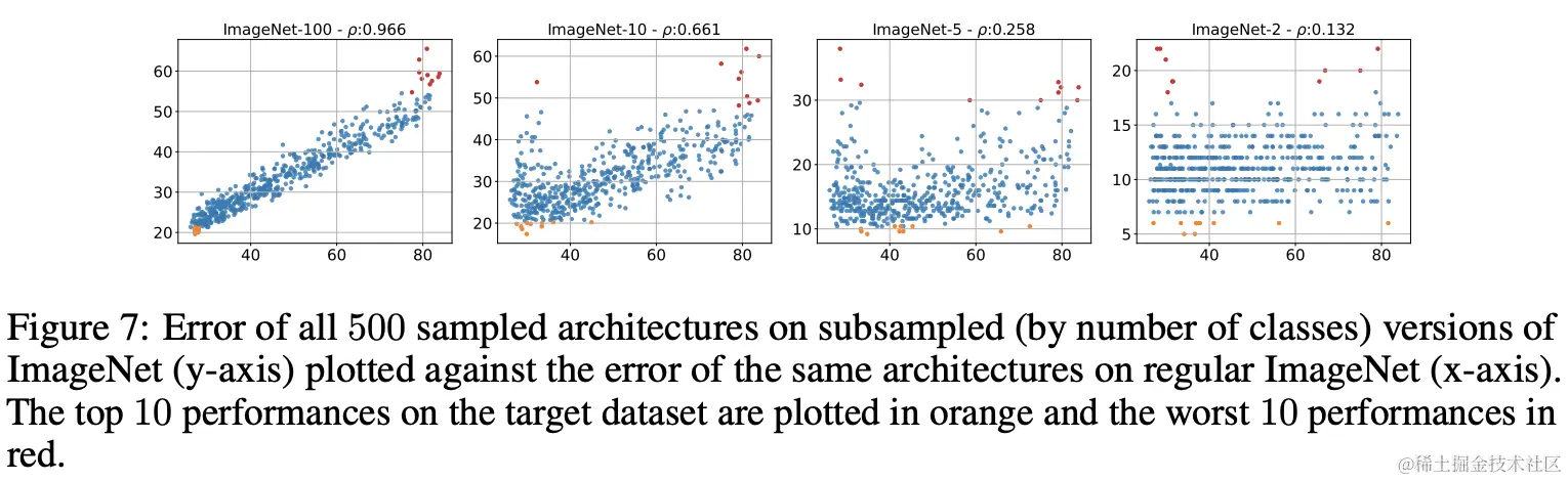 为了回答这一问题,论文提出了APR(architecture and performance relationship)指标。由于模型的性能与数据集相关,数据集间的APR指标能够对比相同结构在不同数据集下的表现。为了让实验更准确,论文随机采样了500个网络,并在多个数据集间进行对比。