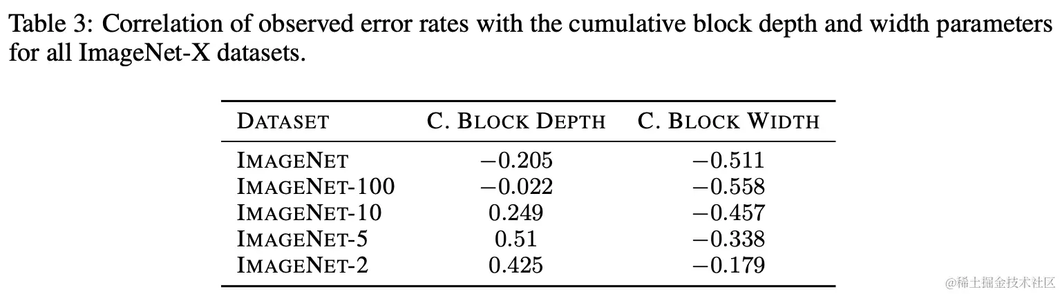 论文也测试了block的累积depth和累积width在ImageNet-X数据集上的表现,结构如表3所示。从表中可以看到,随着类别数增加,累积depth和累积width的相关因子都在逐级增加(不代表相关性增加)。所以,可以认为类别数也是影响block的累积depth和累积width与模型性能相关性的重要因素。