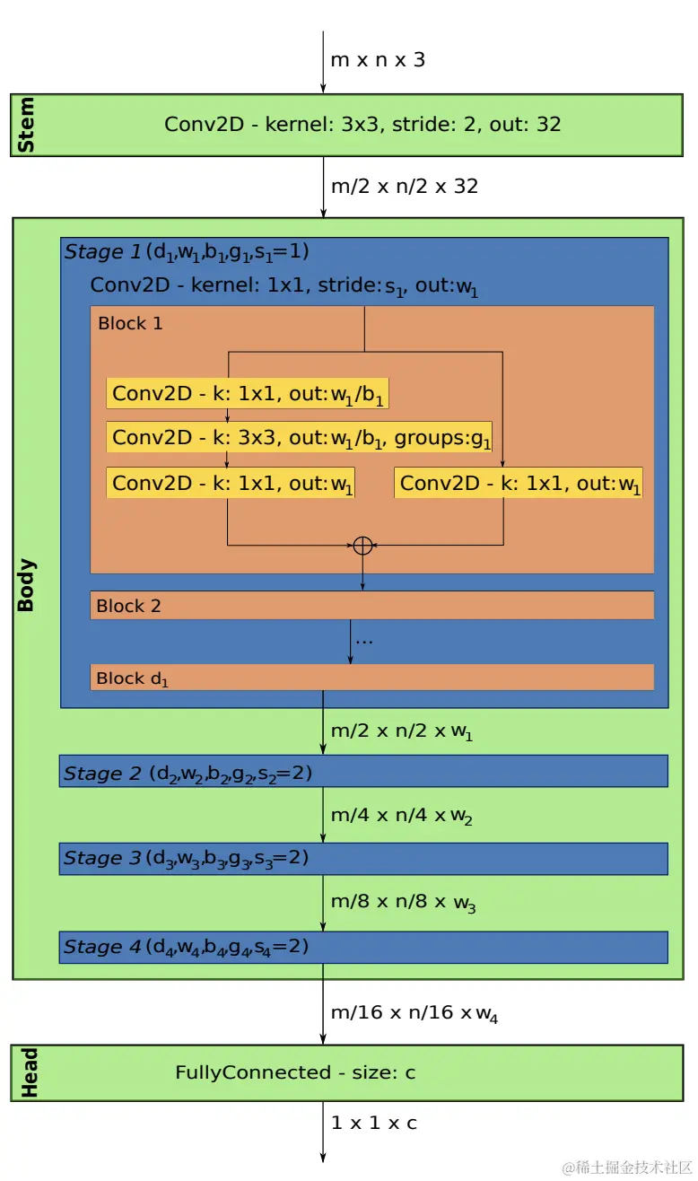 - body:包含4个stage,每个stage 由步长为的卷积开头,后续是个相同的标准residual bottleneck block,width为,bottleneck ratio为,group width为(残差分支的并行子分支),这个参数对相同stage内的block是共享的。