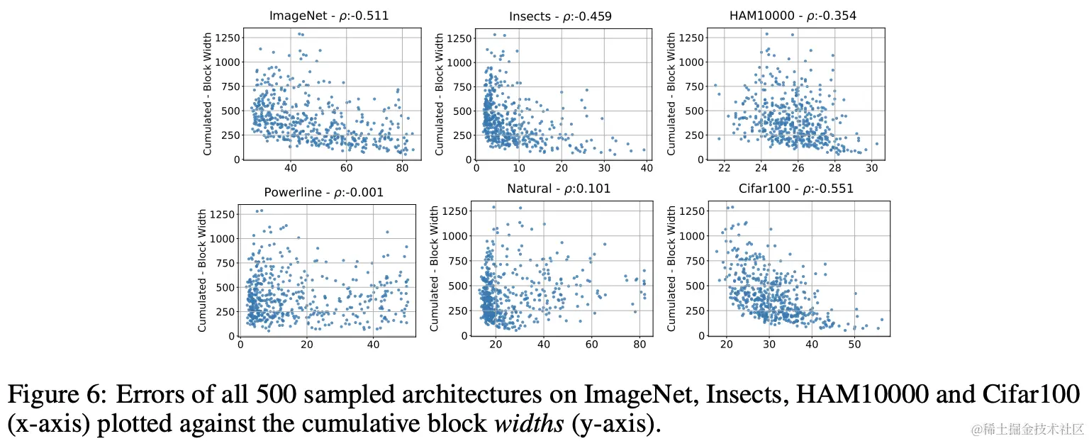 图6为所有stage累积的width depth与模型性能的关系。ImageNet的模型性能与累积width呈反相关,优秀模型的累积width至少为250。Insects和HAM10000数据集也有类似的反相关性,但程度弱一些。Powerline和Natural数据集与累积width没有明显的相关性,而Cifar100数据集则有强烈的反相关性。