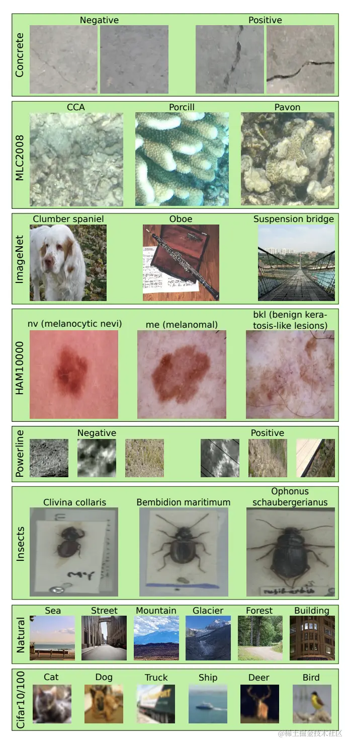 论文共在9个数据集上测试,数据集的样例如上图所示,这里简述下图片数和类别数: