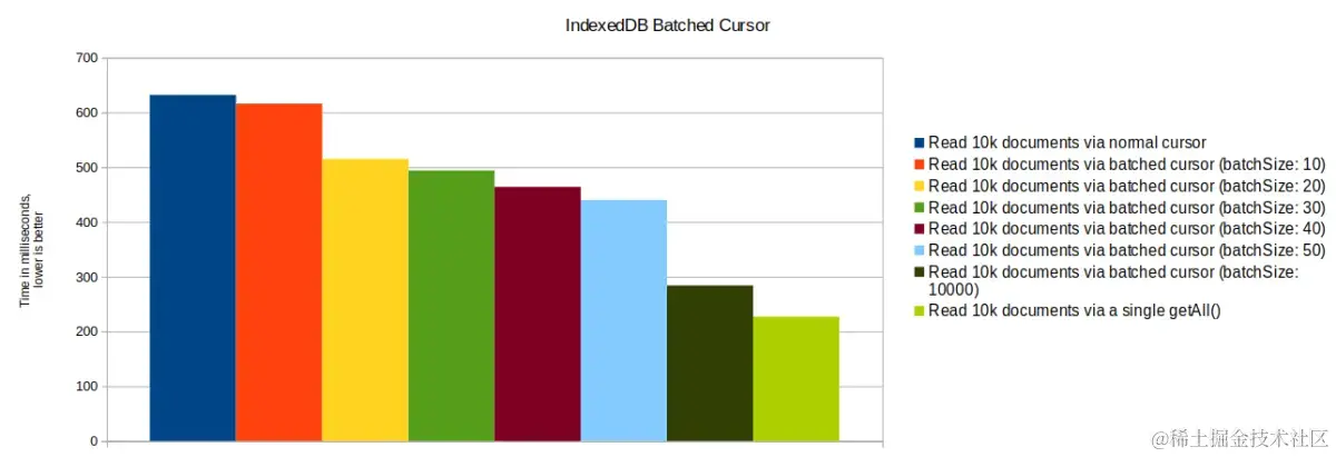 如性能测试结果所示,使用批处理游标可以带来巨大的改进。有趣的是,选择一个较高的批处理大小很重要。当您知道需要给定IDBKeyRange的所有结果时,您根本不应设置批处理大小,而是直接通过getAll()查询所有文档。