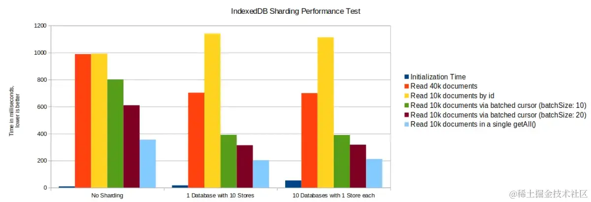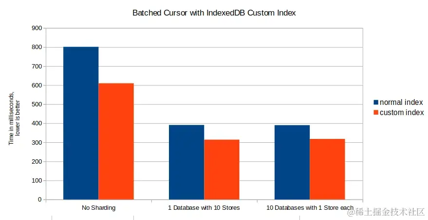 正如性能测试结果所示,分片应始终由IDBObjectStore而不是数据库来执行。使用10个存储分片并行运行整个数据集的批处理游标比在单个存储上运行快约28%。初始化时间从9毫秒增加到了17毫秒。通过批处理迭代索引获取四分之一的数据集时,分片比查询单个存储时的速度快43%。