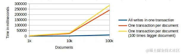 使用比较工具,并将其更改为每个文档写入一个事务。结果出来了。使用每次写入一个事务插入1k个文档,大约需要2秒。有趣的是,如果我们将文档大小增加100倍,存储它们的时间仍然大致相同。这清楚地表明,影响IndexedDB性能的限制因素是事务处理,而不是数据吞吐量。