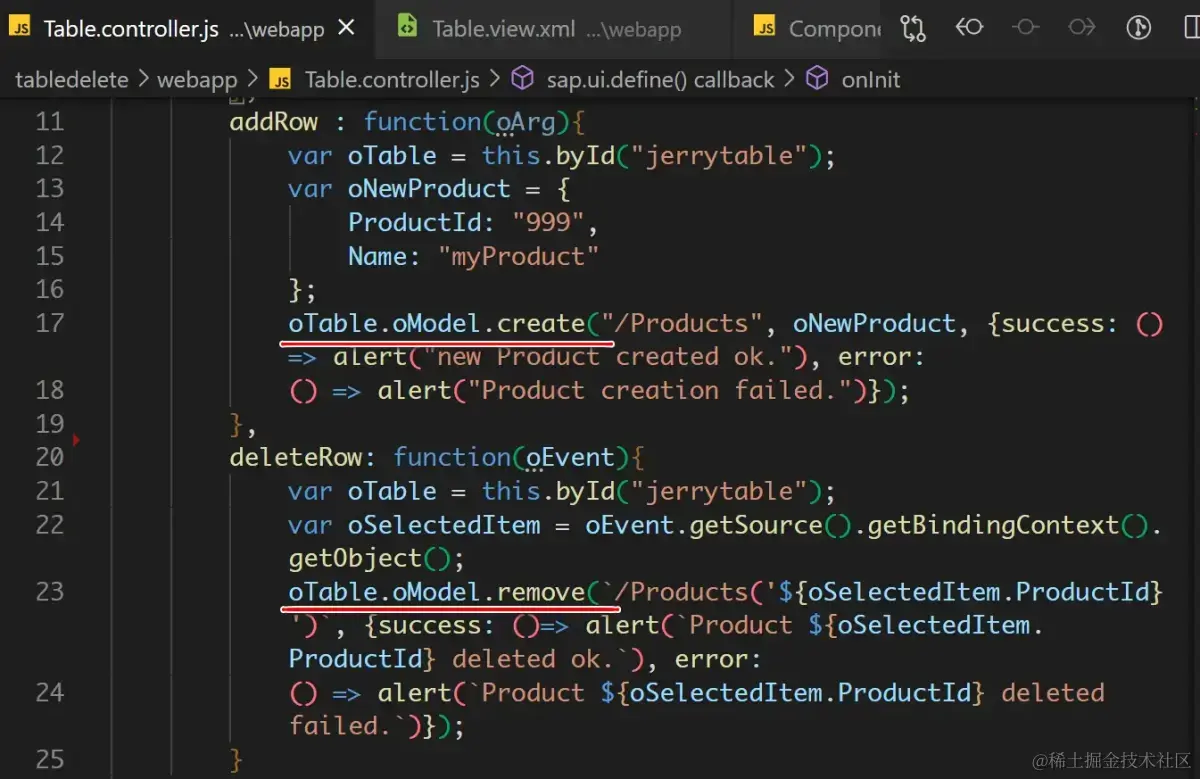 表格控件行项目的添加和删除,直接调用 OData 服务对应的 create 和 remove 方法即可,如下图高亮代码行所示。