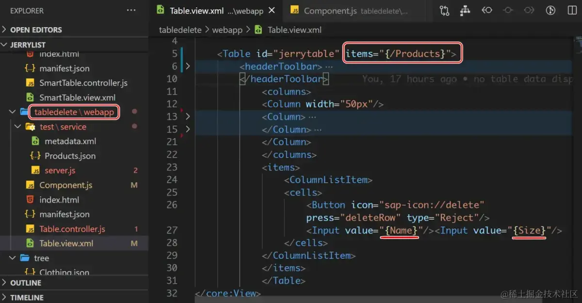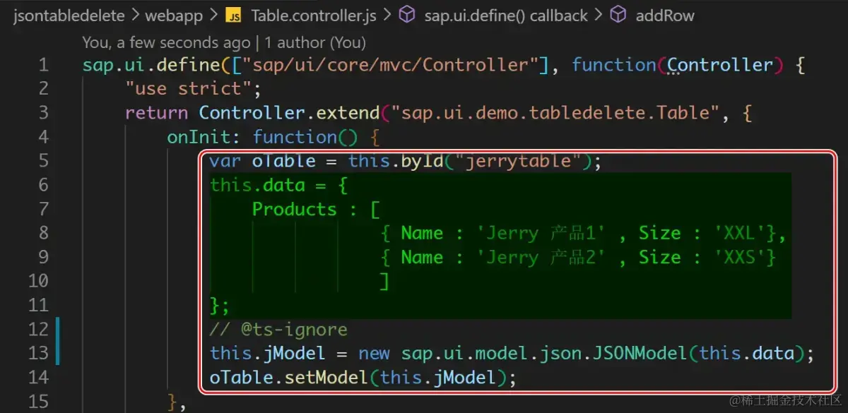 新建 JSON 模型实例,并绑定到表格控件实例的代码如下图所示。其中 this.data.Products 数组变量,维护的是该 JSON 模型硬编码的全部本地数据: