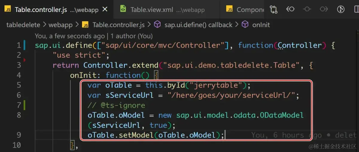 在 Table 控制器的 onInit 方法里,我使用 ODataModel 的构造器,创建了一个 OData 模型实例,将其通过 setModel 方法赋给表格实例 oTable. 模型构造器需要传入一个 OData 服务的路径,这里我传入的路径 /here/goes/your/serviceUrl, 指向的是我本地 MockServer 提供的虚拟 OData 服务。