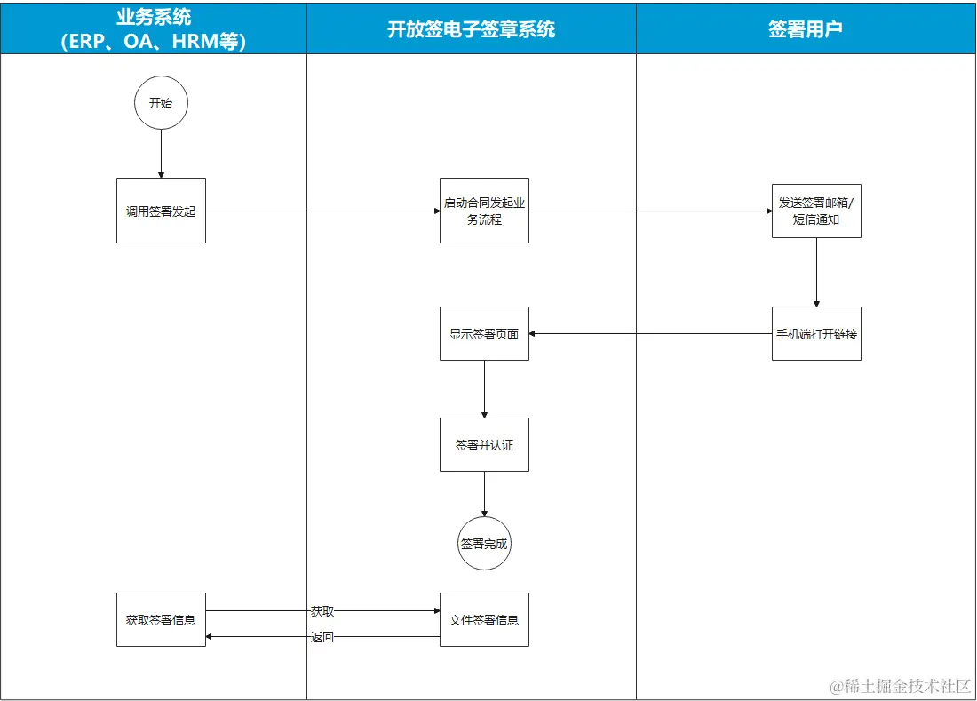 (2)业务系统通过简单集成开放签电子签章系统,即可拥有电子文件签署能力。业务系统集成开放签电子签章系统调用发起签署接口,开放签执行签署业务流程,签署用户基于开放签系统功能完成操作,签署完成后业务系统可通过接口获取签署状态。