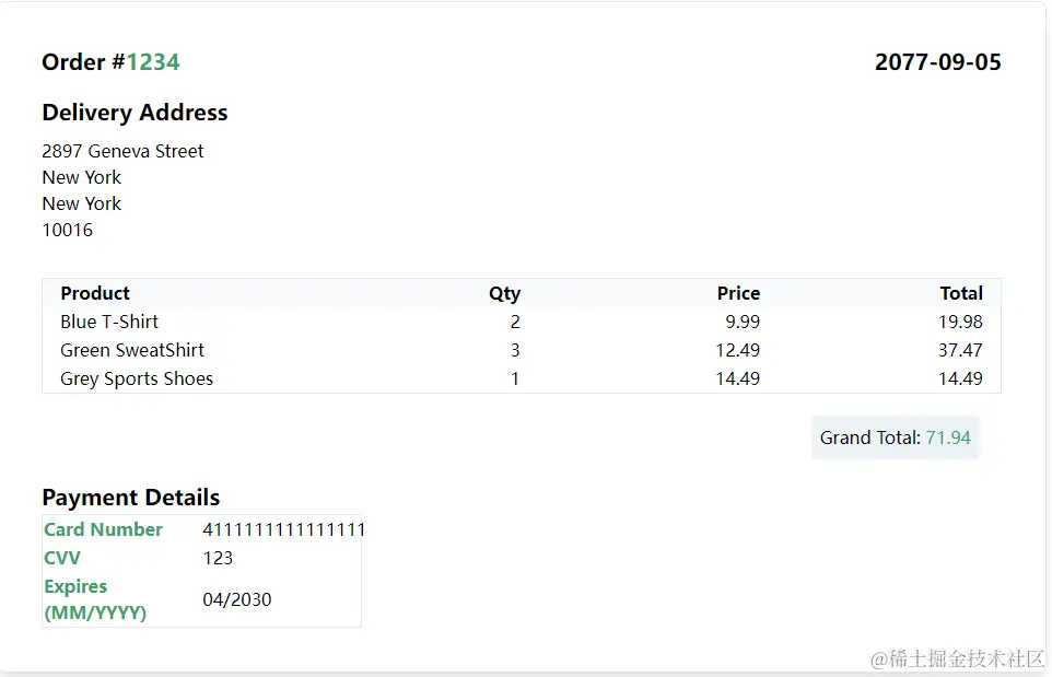 Spring MVC 带有模板引擎,可以提供动态的 HTML 内容。 我们可以通过以下方法轻松将这些回复转换为 PDF 格式。 在本例中,我导入了 spring-boot-starter-web 和 spring-boot-starter-thymeleaf 来为我的 spring boot 项目提供 MVC 和 thymeleaf 支持。 您可以使用自己选择的模板引擎。 看看下面这个thymeleaf模板内容。 主要展示订单详细信息。 另外,通过 OrderHelper 的辅助方法来生成一些虚拟订单内容。