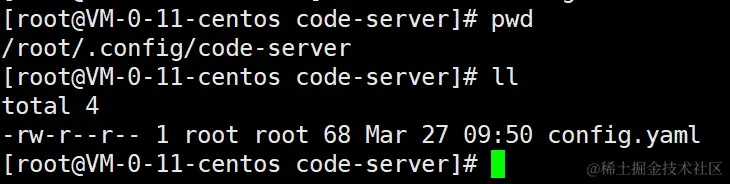 c、第一次执行完 ./code-server 命令后,会在用户目录/.config/code-server下生成一个 config.yaml的配置文件,如图: