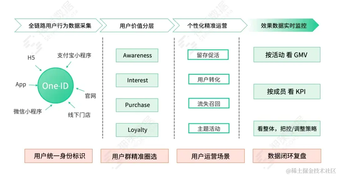 小程序为该品牌主要的流量和转化阵地,其销售平台涉及淘宝、抖音等渠道,多场景融合后导致用户身份识别难度高。因为无法识别用户,当某个指标数据下降时,企业难以通过准确的用户分层和触达来进行优化。为了解决该问题,该品牌制定了 One-ID 方案,打通小程序等多平台的用户消费和行为数据,完成数百万跨平台用户数据资产沉淀,建立完整的用户标签体系;并且在 One-ID 的基础上进行分析和运营,达到次月留存率提升超过 50% 的效果。