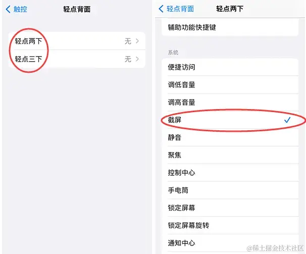 步骤3:根据自己的需要,选择**【轻点两下】或者【轻点三下】。选择完成后,勾选【截屏】**选项。