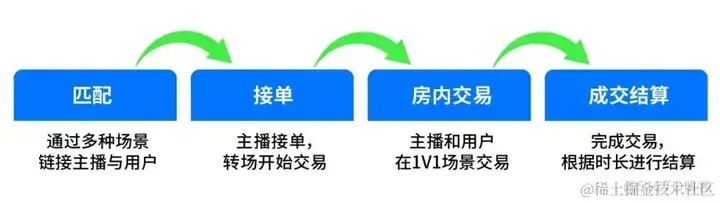 在 1v1 场景中,即构将用户路径拆解为 4 个环节:用户匹配——主播接单——房内互动——成交结算,用户在进行上述路径的每一个阶段转场时,转场间的“丝滑程度”决定了用户是否会完成下单动作,如果各个环节的切换时间过长,用户会选择持续等待、退出应用或者不断切换下一个主播,这之间的任何一种情况最终都会影响用户时长收益及付费订单转化率。