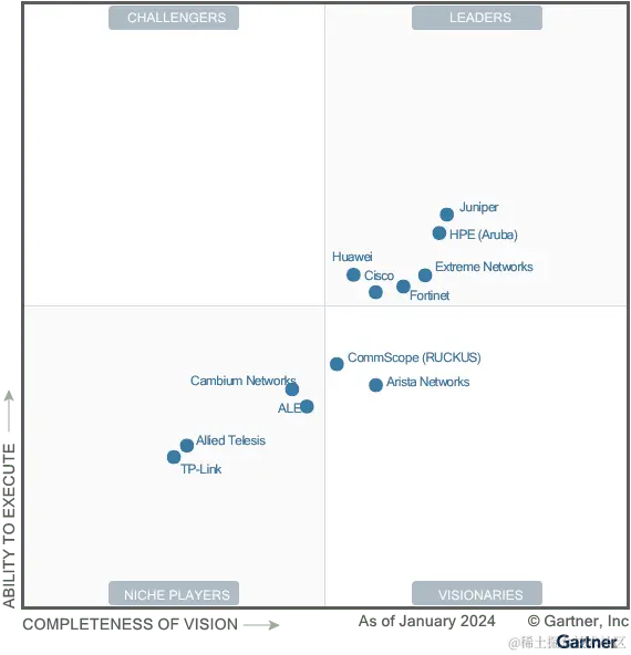 在2024年《企业有线无线局域网基础设施魔力象限》的“领导者”象限中,华为是唯一一家非北美厂商。对于华为入选的原因,Gartner在报告中提到了三个方面的优势: