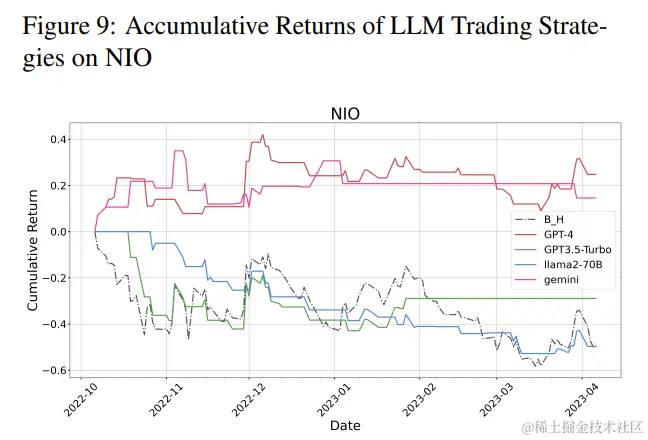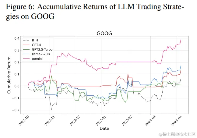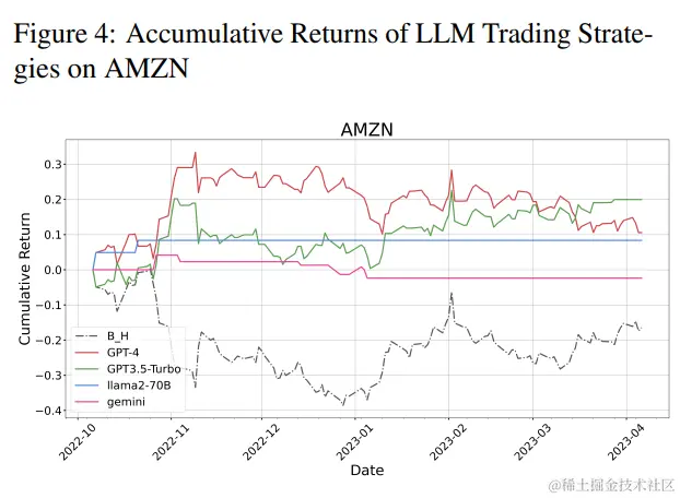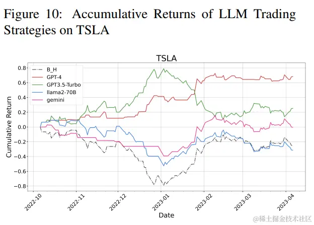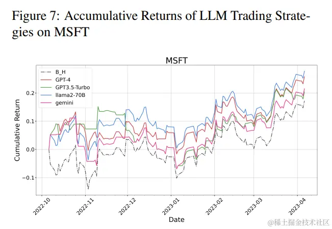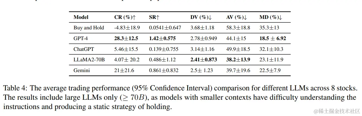 相比之下,ChatGPT展现出显著较低的性能指标,表明其在金融决策能力方面的局限性。另一方面,Gemini确保了第二佳表现者的位置,与GPT-4相比展现出较低的风险和波动性,同时保持着可观的回报。在考虑开源模型时,观察到LLaMA-70B尽管波动性较低,但在LLMs中产生的利润最少,突显了风险管理和盈利能力之间的权衡。