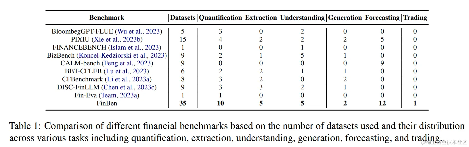 此外,虽然在一般领域新发布了基准测试,如MMLU(Hendrycks等人,2020年)、HELM(Liang等人,2022年)和BIG-bench(Srivastava等人,2023年),它们编译了众多机构的大量任务,但并未扩展到金融领域。LLMs的快速发展,加上对它们能力和行为的不完全理解,凸显了需要一个专门针对这些模型的系统性金融评估基准。