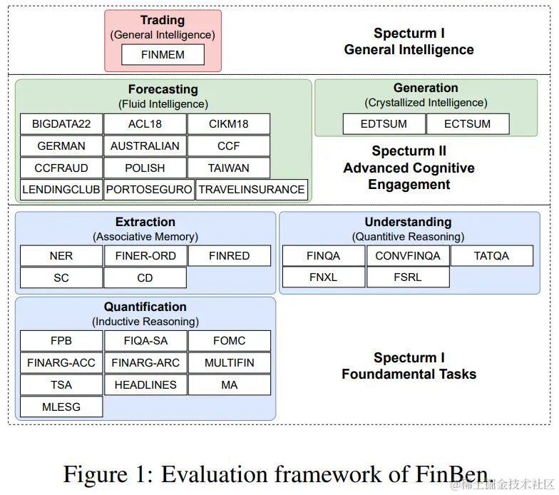 为了弥补这一差距,我们提出了FinBen,这是第一个开源的(我们将向研究社区发布所有资源。)全面评估基准,专为评估金融领域LLMs的能力而设计。如图1所示,FinBen包括35个数据集,涵盖23个金融任务,分为三个难度谱系,灵感来自心理学和教育领域的Cattell-Horn-Carroll(CHC)理论(Schneider和McGrew,2012年),以评估LLMs在各种认知领域,包括归纳推理、联想记忆、定量推理、结晶智力、流体智力和一般智力。谱系I包括基础任务,如量化、提取和数值理解,为基本认知技能奠定基础。