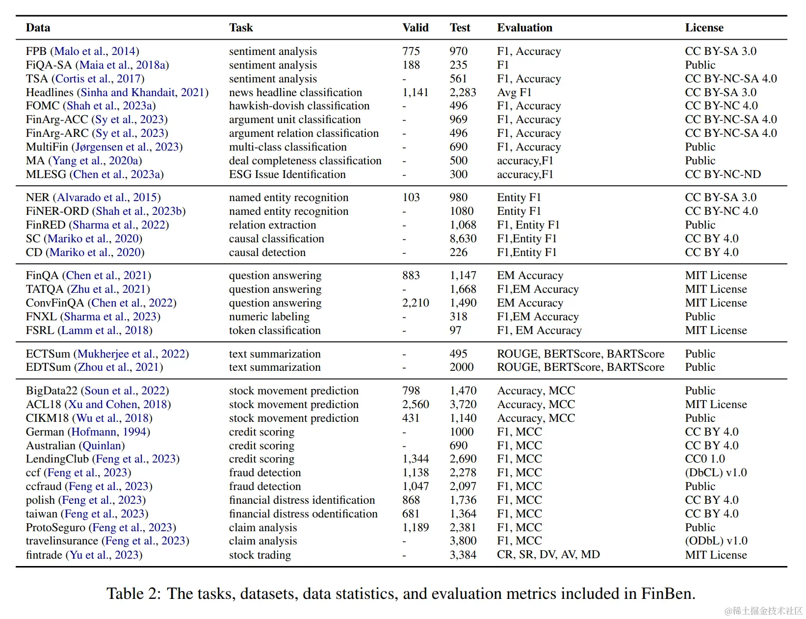 金融评估基准,例如开创性的FLUE(沙等人,2022年),已经被引入来衡量模型在金融领域的性能,涵盖五个关键的自然语言处理(NLP)任务:金融情感分析(沙等人,2022年)、新闻标题分类(Sinha和Khandait,2020年)、命名实体识别(NER)(Salinas Alvarado等人,2015年)、结构边界检测和问答(QA)(Maia等人,2018b年)。在FLUE的基础上,FLARE(谢等人,2023年b)增加了对时间序列处理能力的评估,即预测股票价格变动。此外,在中文金融基准中,最近发布了更多中文数据集,如CFBenchmark(雷等人,2023年)、DISC-FINSFT(陈等人,2023年b)和CGCE(张等人,2023年b)。然而,这些基准的范围有限,尚未解决更复杂的金融NLP任务,如事件检测(周等人,2021年),以及尽管之前有股票交易方面的努力(刘等人,2022年;韩等人,2023年a,b),但尚未涉及现实金融任务。