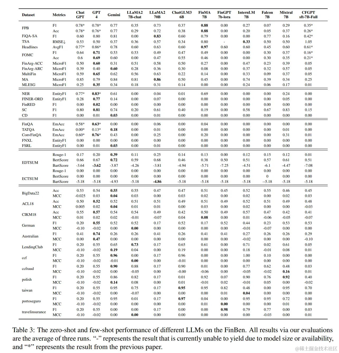 我们评估了15种代表性的通用大型语言模型(LLMs)和金融领域特定语言模型(LLMs)在FinBen基准测试中的零样本和少样本性能,包括:1) ChatGPT:由OpenAI开发的具有1750亿参数的指令遵循型LLM。2) GPT-4(OpenAI, 2023b):由OpenAI提出的具有大约1000亿参数的强大指令遵循型LLM。3) Gemini Pro(Team et al., 2023):由谷歌发布的具有5000亿参数的多模态AI LLM。4) LLaMA2-70B(Touvron et al., 2023):由MetaAI开发的具有700亿参数的指令遵循型LLM。5) ChatGLM3-6B(Du et al., 2022):由Zhipu AI和清华大学KEG联合发布的具有60亿参数的对话型LLM。6) Baichuan2-6B(Baichuan, 2023):由Baichuan智能科技推出的具有60亿参数的开源LLM。7) InternLM-7B(Team, 2023b):由商汤科技提出的为实际场景量身定制的70亿参数开源基础模型。9) Falcon7B(Almazrouei et al., 2023):一个在1500亿个经过策划的语料库增强的RefinedWeb令牌上训练的70亿参数因果解码器唯一型LLM。10) Mixtral 8×7B(Jiang et al., 2024):一个采用稀疏专家混合(SMoE)架构的LLM。11) Code Llama-7B(Roziere et al., 2023):由Meta AI发布的用于生成编程代码的开源LLM模型,具有70亿参数。12) FinGPT(Yang et al., 2023a):一个经过情感分析任务微调的70亿指令金融LLM。13) FinMA-7B(Xie et al., 2023b):一个经过多项自然语言处理和预测任务微调的70亿指令金融LLM。14) DISCFinLLM(Chen et al., 2023c):由Baichuan-13B-Chat(Baichuan, 2023)微调而来的开源金融LLM。15) CFGPT(Li et al., 2023a):一个专门为金融领域设计并在中国金融数据集上训练的开源LLM,包含70亿参数。所有实验均仅使用5块NVIDIA TITAN RTX图形处理单元和2块NVIDIA GeForce RTX 3090处理单元进行,完成时间约为20小时。平均每个实验分配2个GPU,总计约为20400个GPU小时。