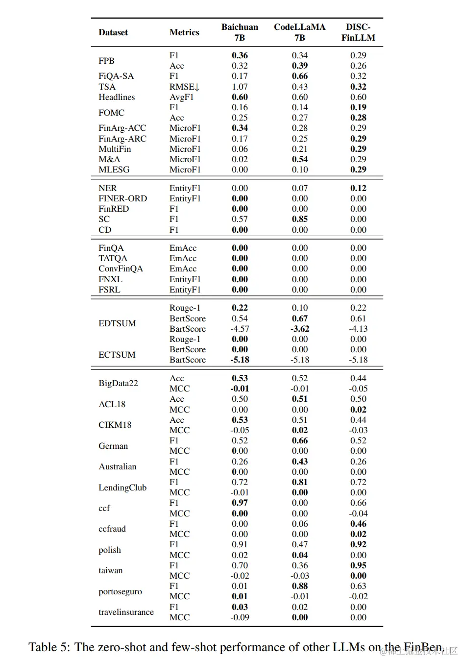 Table 5 presents other LLMs’ performance in the FinBen.