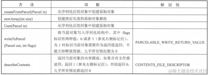 内容描述功能由describeContents方法完成,几乎所有情况这个方法都应该返回0,仅当当前对象中存在文件描述符时,返回1