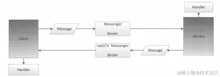 客户端进程首先绑定服务端的Service,绑定成功后用服务端返回的IBinder对象创建一个Messenger,通过这个Messenger向服务器端发送消息,消息类型为Message对象。如果需要服务端回应,则需要在客户端创建一个Handler,并创建一个新的Messenger,并把这个Messenger对象通过Message的replyTo参数传递给服务端,服务端通过这个replyTo就可以回应客户端。