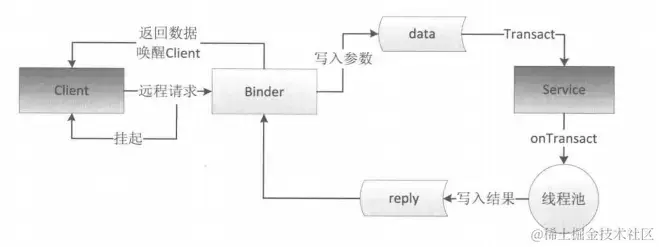 - Proxy#XXX方法:运行在客户端,当客户端远程调用此方法时:内部会首先创建该方法所需要的输入型Parcel对象_data、输出型Parcel对象_reply和返回值对象,然后将参数信息写入_data中(如果有参数的话),接着调用onTransact()发起RPC请求(远程过程调用),同时当前线程挂起;然后服务器onTransact()方法调用,直到RPC返回后当前线程继续执行。