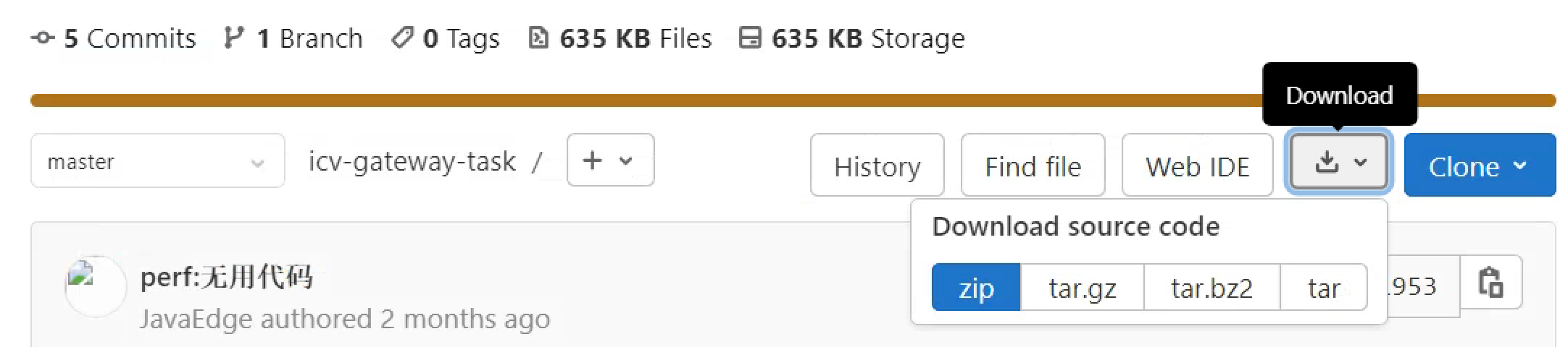 在 gitlab 仓库页面,点击下载,注意使用 gz 格式!!!