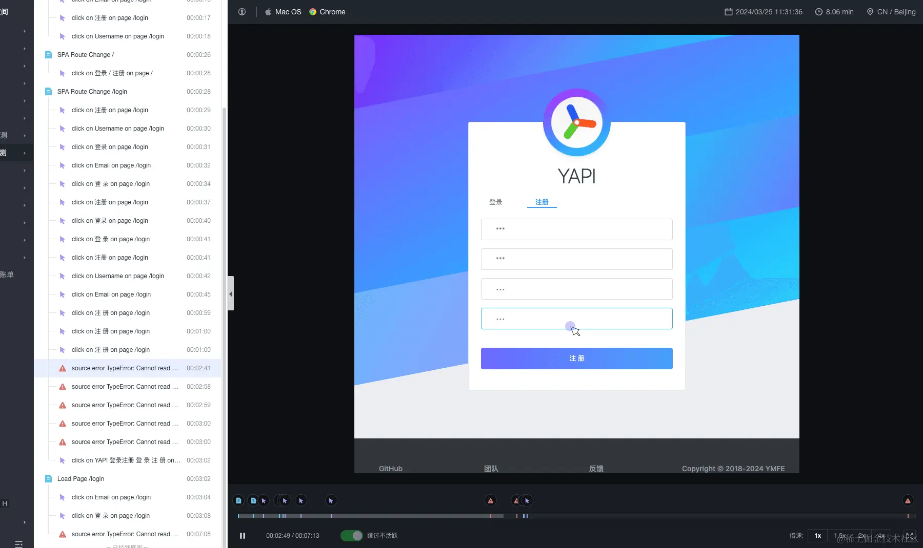 - 录制回放效果,包括能直接看到报错的详情