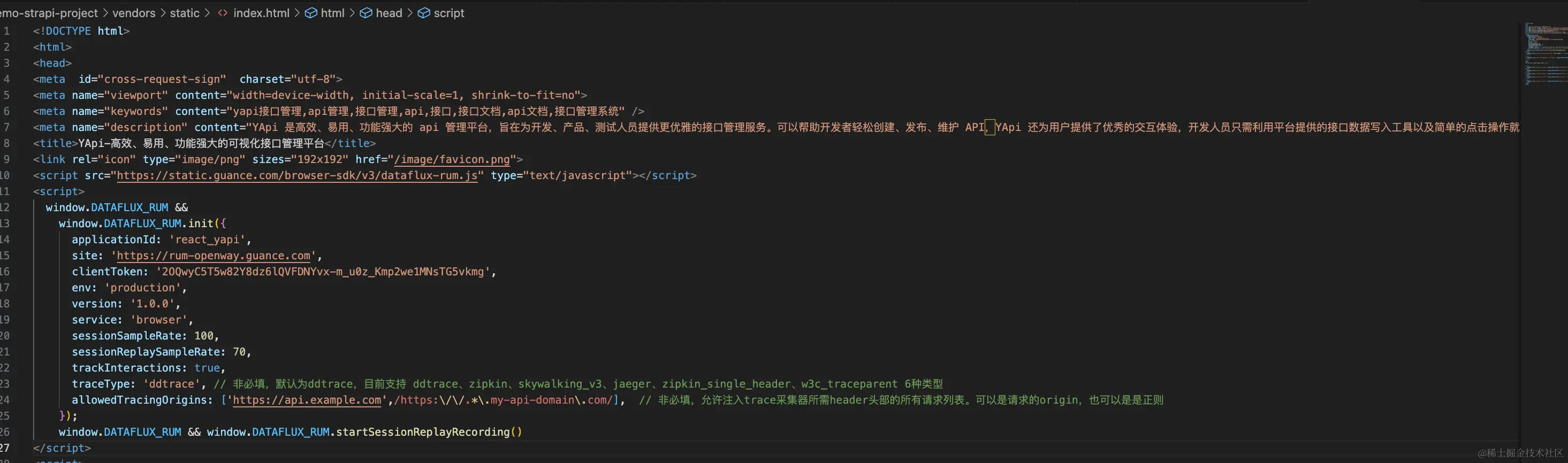 在当前目录下找到 index.hml 并把观测云接入代码拷贝到 head 标签内,如下图所示。