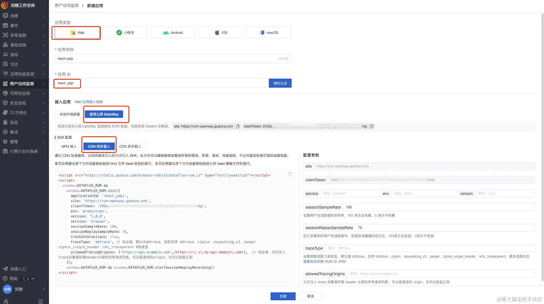 第一步:在观测云创建应用