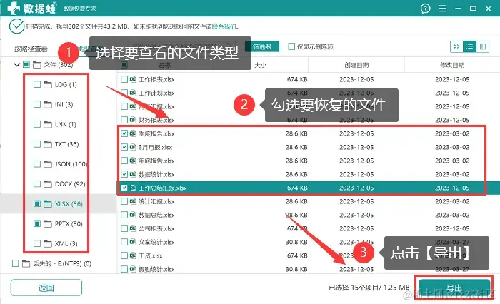 步骤3:核对所有需要恢复的文件勾选完毕后,点击 【导出】,再选择一个与文件原保存位置不一样的磁盘作为导出后的保存位置即可。