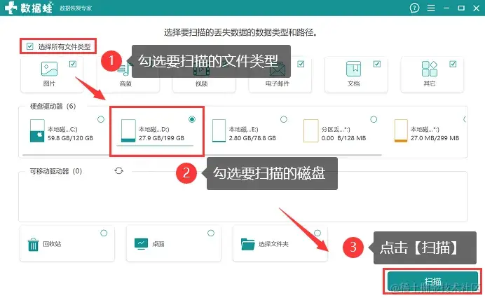 步骤1:打开软件后,先将需要扫描的文件类型勾选上,并将需要扫描的磁盘勾选上,单击 【扫描】 ;