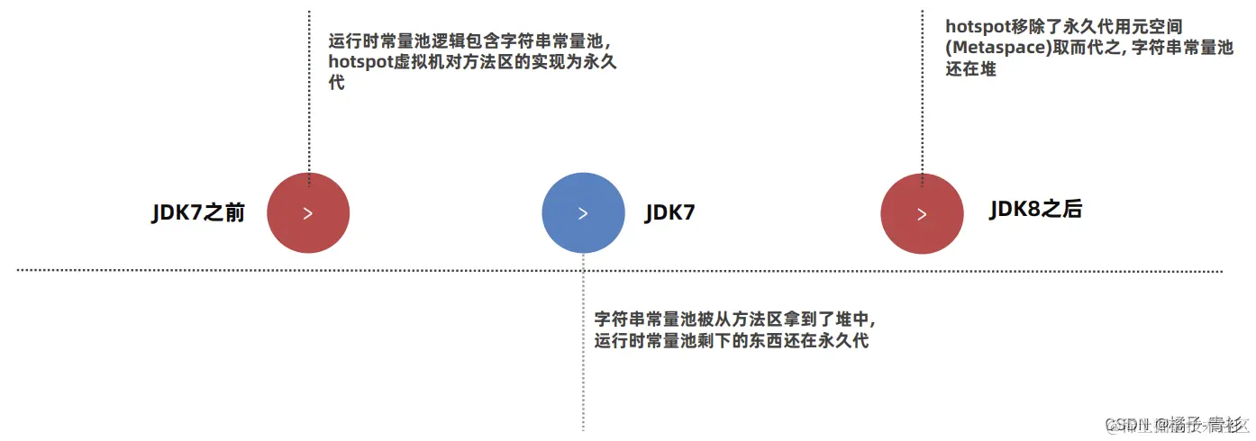- JDK 7之前: 在这一时期,字符串常量池是方法区的一部分,位于永久代内。这意味着字符串实例和类的元数据都存储在永久代中。