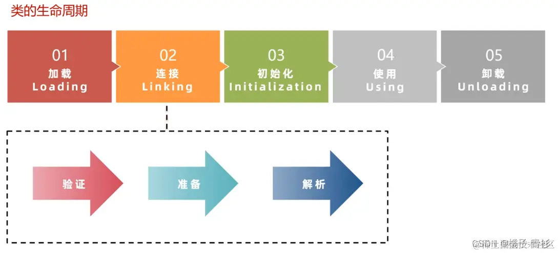 Java类的生命周期主要包括加载(Loading)、连接(Linking)、初始化(Initialization)、使用和卸载(Unloading)五个阶段。这些阶段确保了类从被加载到JVM中,到其被使用,再到最终被卸载的整个过程。