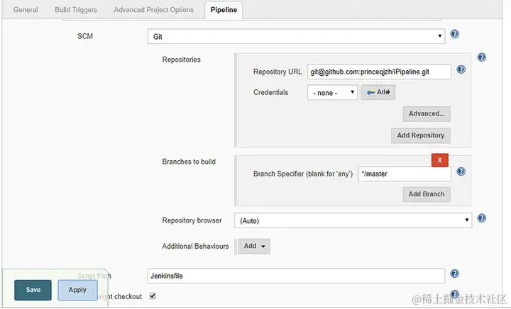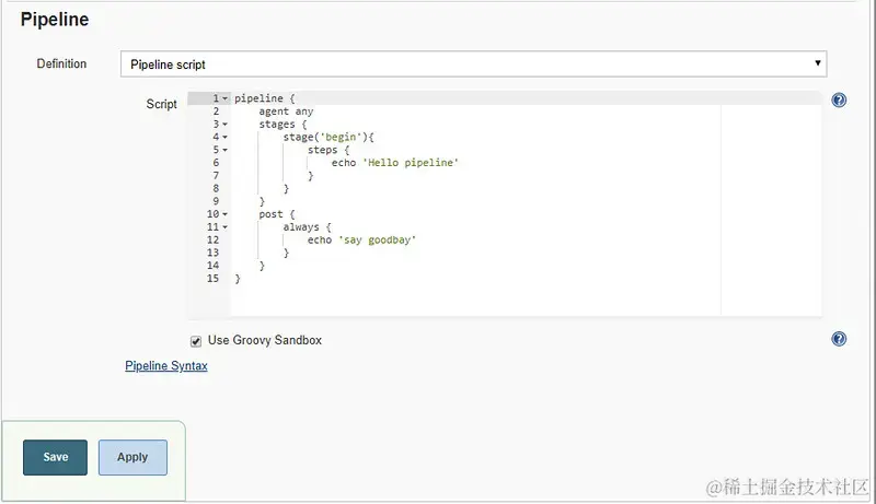 - Definition 中选择 Pipeline Script