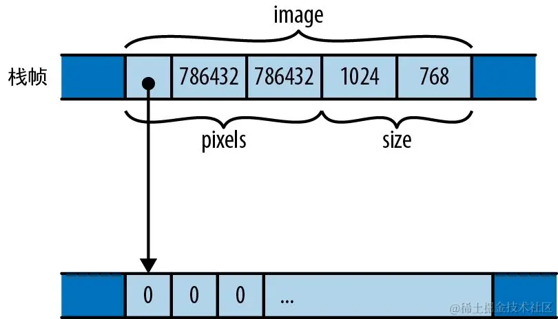 与 C 和 C++ 不同,Rust 没有具体承诺它将如何在内存中对结构体的字段或元素进行排序,图 9-1 仅展示了一种可能的安排。然而,Rust 确实承诺会将字段的值直接存储在结构体本身的内存块中。JavaScript、Python 和 Java 会将 pixels 值和 size 值分别放在它们自己的分配在堆上的块中,并让 GrayscaleMap 的字段指向它们,而 Rust 会将 pixels 值和 size 值直接嵌入 GrayscaleMap 值中。只有由 pixels 向量拥有的在堆上分配的缓冲区才会留在它自己的块中。